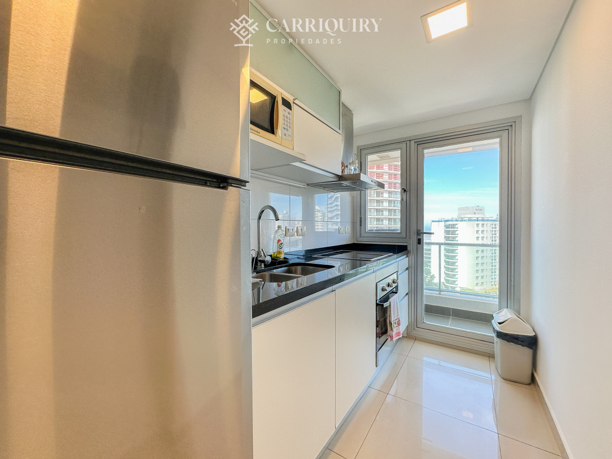Cómodo apartamento a pasos de playa brava con muy buenos servicios, piso alto con vista, living-comedor con terraza, cocina definida, dos dormitorios (1 suite), dos baños. Ideal para disfrutar! No acepta mascotas.