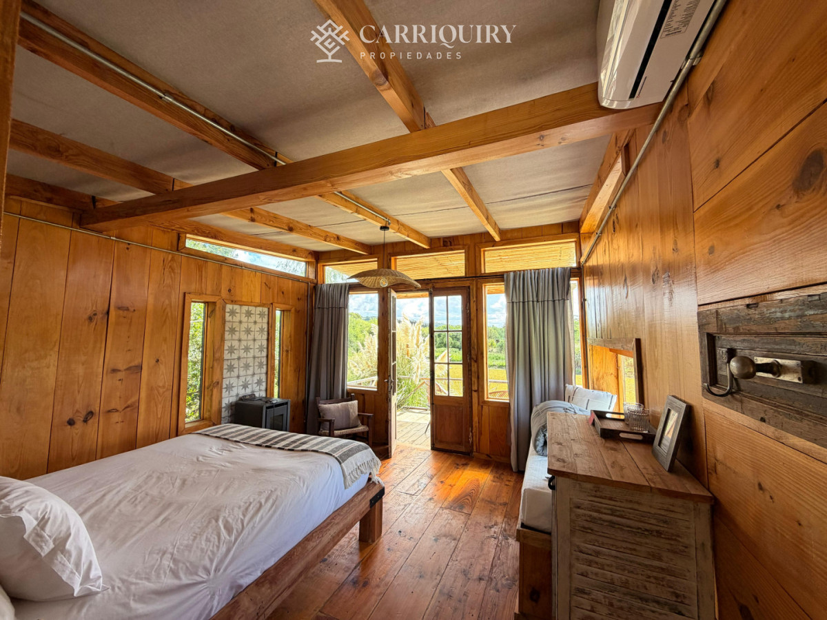 La propiedad cuenta con una casa principal de 2 dormitorios y 2 baños, con cocina comedor integrados y estufa de alto rendimiento, que brinda un ambiente cálido y confortable durante todo el año.